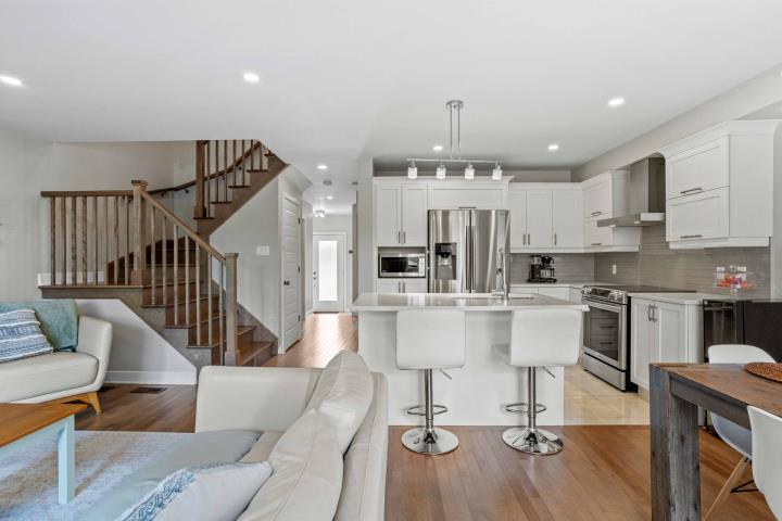 This move-in ready townhome, built in 2018 with key upgrades and finishings, checks all the boxes. The bright main floor features open-concept living and dining, a chef's kitchen with quartz counters and extended island, plus main floor laundry. Upstairs, enjoy a stylish bathroom with separate soaker tub, double vanity and three generous-sized bedrooms. The finished basement adds a full bath and flexible living space. Outside, a private fenced yard with deck, pave uni patio, and no rear neighbours awaits. Ideally located near schools, shops, parks, and golf courses. Book your visit today!